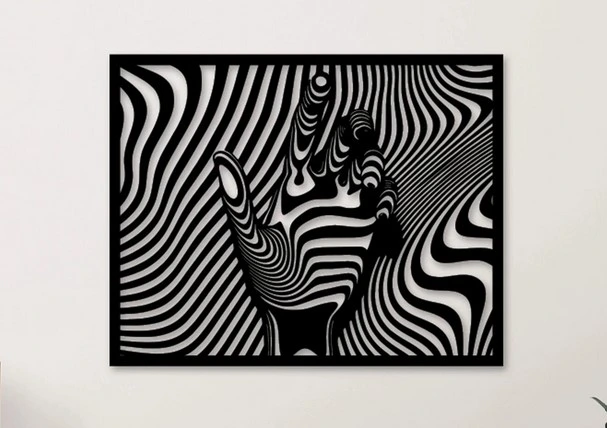 Ce cadre mural en bois artisanal ajouré est une véritable prouesse d’illusion optique : une main semble surgir du mur en trois dimensions, enveloppée d’ondes rayées noires qui ondulent et vibrent sous le regard. Le motif crée un effet cinétique fascinant – selon l’angle et la lumière, la main paraît avancer ou reculer, les lignes semblent se déplacer, captivant instantanément l’observateur.