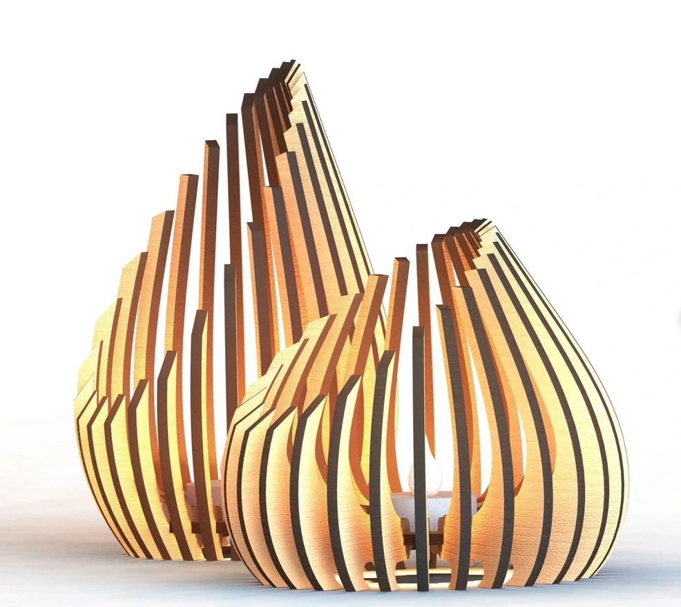 Lot de 2 photophores flammes entrelacées en bois naturel découpé artisanal. Motif ajouré pour diffusion lumineuse chaleureuse et hypnotique. Création française unique déco cosy.