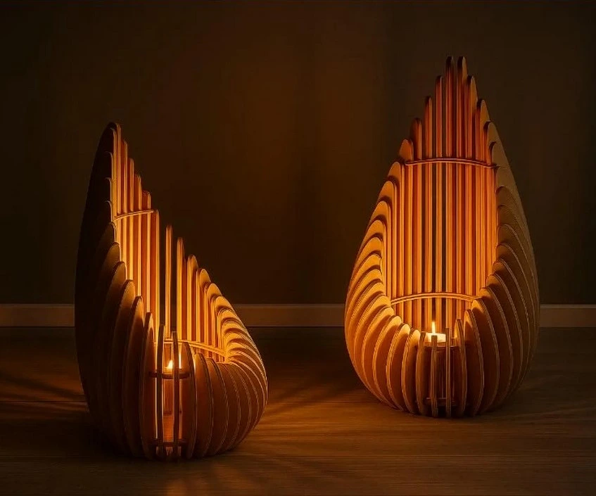 Ce lot de 2 photophores en bois découpé artisanal apporte une ambiance cosy et design à votre intérieur. Chaque pièce adopte une forme organique de goutte ou de flamme stylisée, composée de lamelles de bois courbées et assemblées avec précision. La structure ajourée permet à la lumière de la bougie chauffe-plat de se diffuser doucement à travers les espaces, créant un halo chaleureux et des ombres ondulantes qui évoquent une flamme vivante et apaisante.