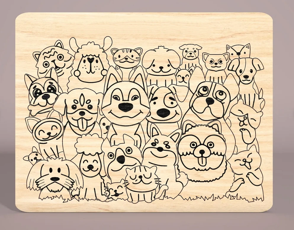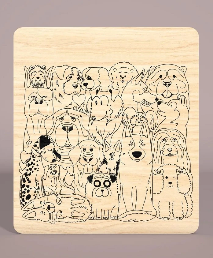 Chaque pièce est découpée dans du bois naturel clair et gravée au laser avec des détails expressifs : yeux pétillants, langues pendantes, poils texturés… Sans aucune peinture, ce puzzle met en valeur la chaleur du bois tout en offrant un défi ludique grâce à des formes irrégulières qui demandent observation et logique.